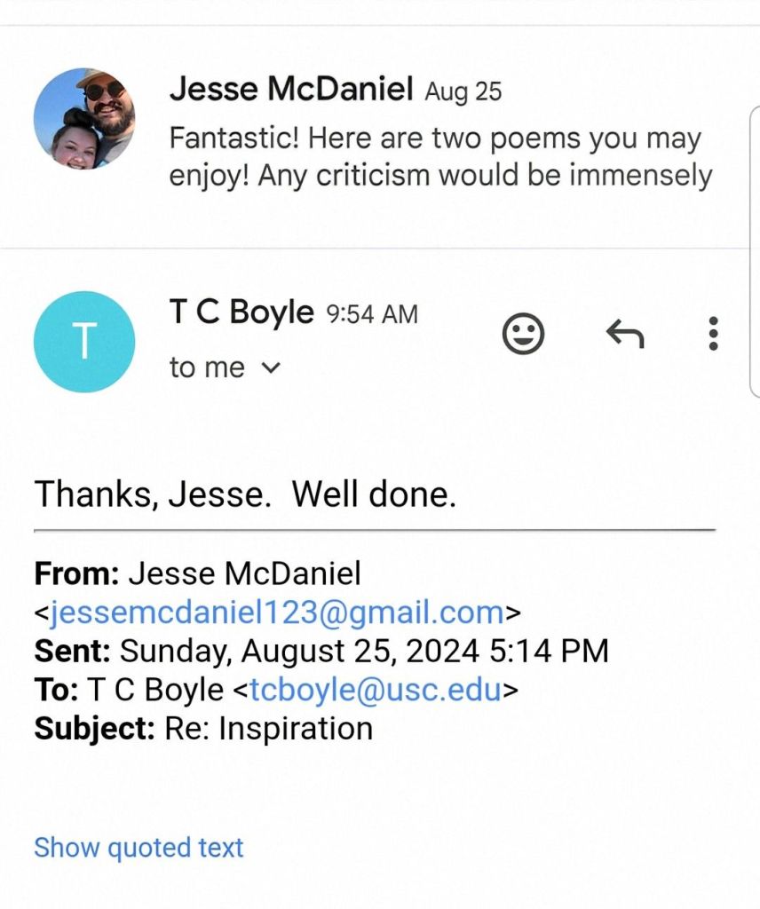 Today, I received an awesome email from one of my favorite authors, T.C Boyle! I remember reading The Tortilla Curtain in college and was amazed. Just thought I would toot my own horn ๐Ÿ‘By the way, it’s worth a read!